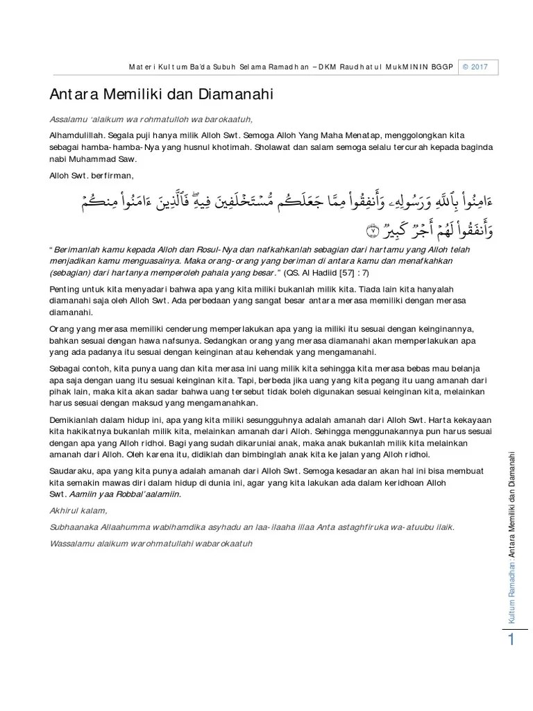 Materi Kultum Amanah : 30 Contoh Teks Ceramah Singkat Umum Bahasa Indonesia : Dalam kesempatan ini, ustadz firdaus sanusi membawakan materi berjudul bagaimana menjaga amanah.. Dalam kesempatan ini, ustadz firdaus sanusi membawakan materi berjudul bagaimana menjaga amanah. Allah swt berfirman (yang artinya): Menjaga kebersihan diri seorang muslim sangan berpernaruh terhadap kesehatan, dan secara tidak langsung menjadi cermintan bagi keimanan . Kelima, dipahami dalam pengertian sangat luas sebagai tugas keagamaan maupun kemanusiaan. Materi kultum singkat tentang amanah.