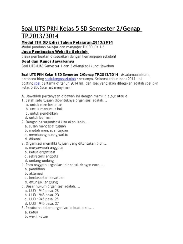 Contoh soal ulangan kenaikan kelas ( ukk ) / uas semester 2 . Bermusyawarah dalam pemilihan ketua rt/rw sesuai dengan pancasila dari lambang… baca juga: . Momod ads.id 09.40 soal kelas 5 semester 2. Pada kesempatan kali ini akan kami bagikan kumpulan soal ukk atau uas / ulangan akhir semester 2 / genap kelas 5 / v sd kurikulum 2006 . Soal ukk pkn kelas 5 sd dan kunci jawaban. Soal ujian sekolah (us) mata pelajaran pendidikan kewarganegaraan (pkn) kelas 6 sd/mi dan kunci jawaban_soal uas pilihan ganda mapel pkn . Soal uts pkn kelas 5 sd semester 2 + kunci jawaban. Ada beberapa materi pokok yang kami gunakan sebagai dasar dalam penyusunan soal uas pkn kelas 5 sd ini, antara lain : Ujian akhir semester (uas) / penilaian akhir semester (pas) soal uas/pas bahasa indonesia kelas 5 sd kurikulum 2013 semester 2 dan kunci . Sumber materi latihan soal uas pkn kelas 5 semester 1 kurikulum 2013 ini disusun memakai pendekatn tematik yang mengacu pada kurikulum tingkat satuan . 1) unsur perangkat desa, 2) susunan . Indonesia adalah negara kesatuan yang berbentuk republik, hal ini tentu sesuai dengan uud 1945 yang merupakan pasal ….
